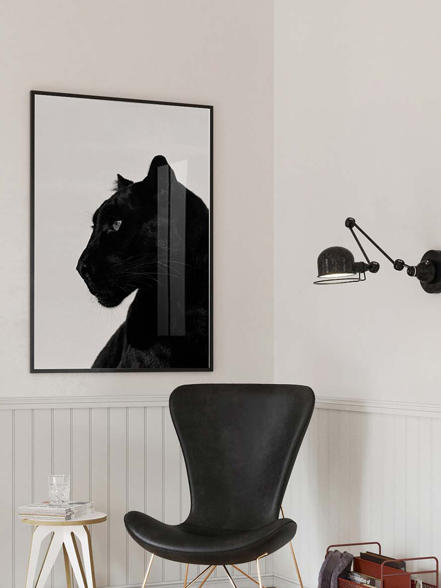 A large piece of glass art displaying a magnificent picture of an adult black panther profile on a white background with a matching black frame.
