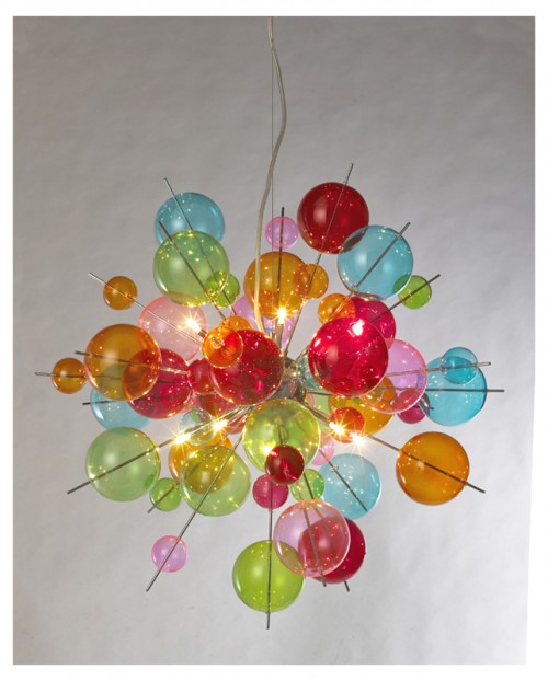 A fabulous modern ten light chandelier constructed of multicoloured and clear glass ball decorations.